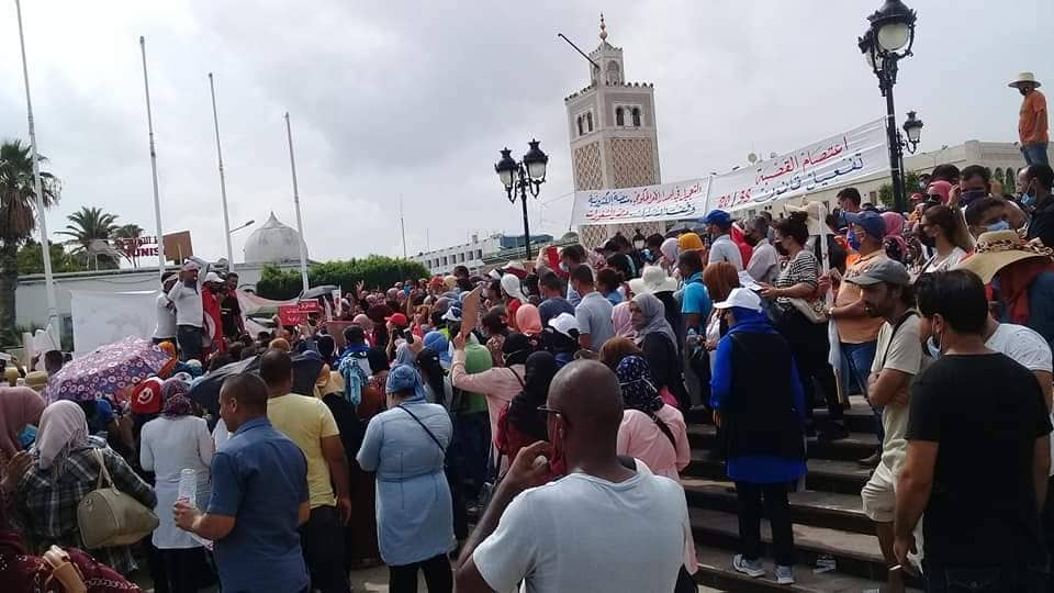 غصت اليوم 21 سبتمبر 2020 ساحة الحكومة بالقصبة بمئات المحتجين و المعتصمين الذين هبوا من كل صوب، جاؤوا من كامل ولايات الجمهورية دون استثناء لمساندة من رابطوا بساحة القصبة منذ 09/09/2020 يفترشون الارض و يلتحفون السماء لا لشئ الا لافتكاك حقهم في التشغيل، احتجوا للمطالبة بتعجيل تفعيل قانون عدد 38 لسنة 2020 المتعلق بالاحكام الاستثنائية للانتداب بالقطاع العمومي من طالت بطالتهم عشر سنوات فما فوق من خريجي الجامعات. من اهم مطالبهم: -الاسراع بانشاء منصة الكترونية وطنية تتضمن اسماء المعنيين بالقانون 38 لسنة 2020 -اصدار الامر الحكومي في اقرب وقت -احداث ميزانية تكميلية للدفعة الاخيرة لسنة 2020 و كان المشيشي قد اجتمع بالولاة يوم السبت 19/09/2020 و دعا فيها الولاة الى تفعيل مقتضيات القانون مؤكدا على دورهم الهام في اعداد قاعدة بيانات تم احداثها للغرض تتضمن المعنيين بهذا القانون.